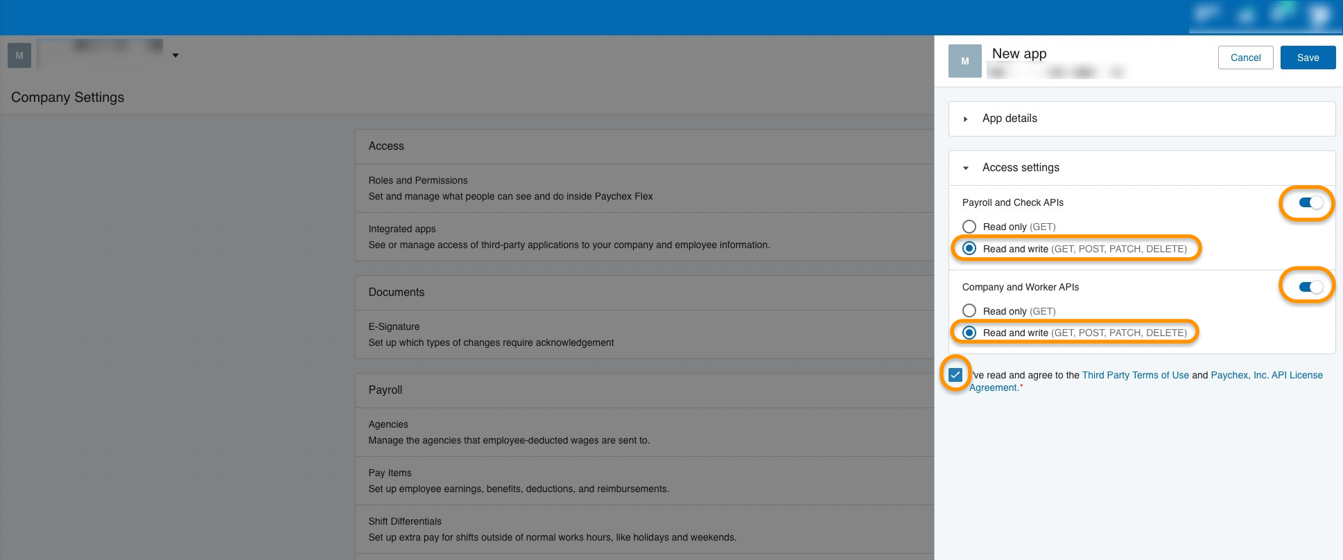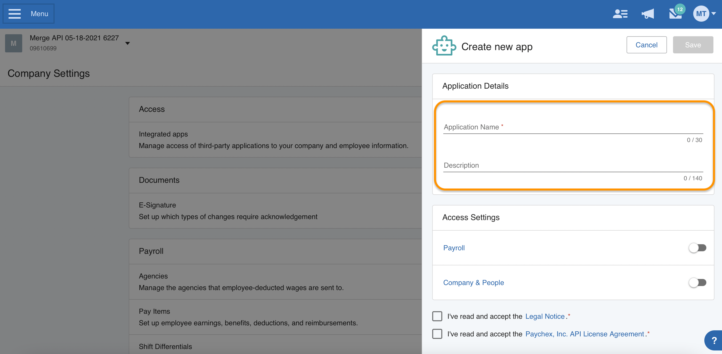 * Select the checkbox for legal notice & Paychex Inc., API License agreement.