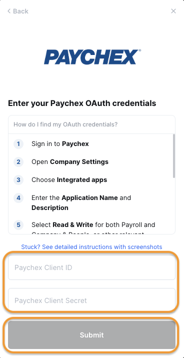 * On Paychex window, enter your Client ID and Client Secret you copied from Step 1, then click **Submit**.