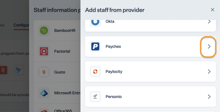 * On Add staff member page, select Add staff from HRMS, then click the details button next to Paychex.