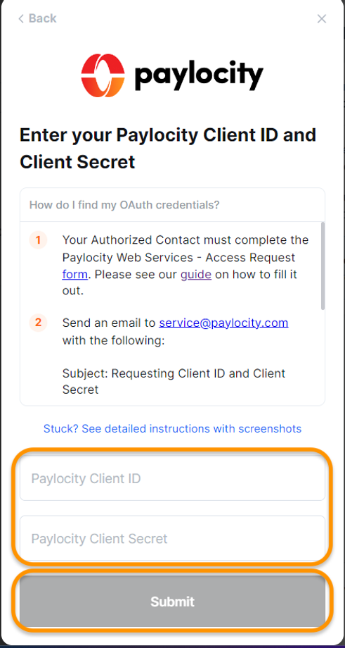 * On Paylocity window, enter your organization’s client ID and client secret you have received from Paylocity from Step 1, then click Submit.