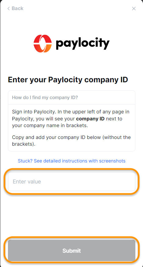 * Enter the company ID you copied from Step 1, then click Submit.Note: This completes connecting your Paylocity account on Sprinto.<br>