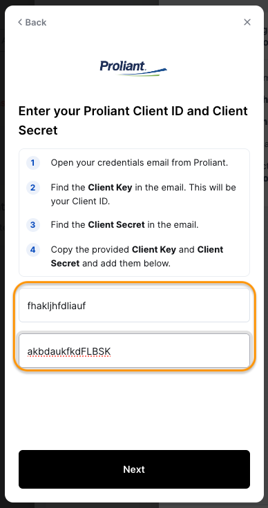 Enter the Client ID and Secret in the respective fields, and click Next.
