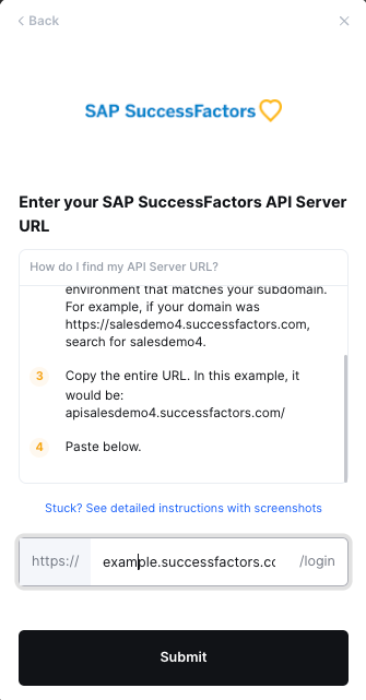 * Copy the account's subdomain from the browser's address bar. For example, if your browser has the URL "**<https://example.successfactors.com/>,**" your API Server URL would be "api.example.successfactors.com."