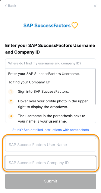 * Enter the Username and Company ID copied from Step 1, and click Submit.
