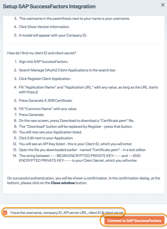 * Select the acknowledgment checkbox, and click Connect to SAP SuccessFactors.\
