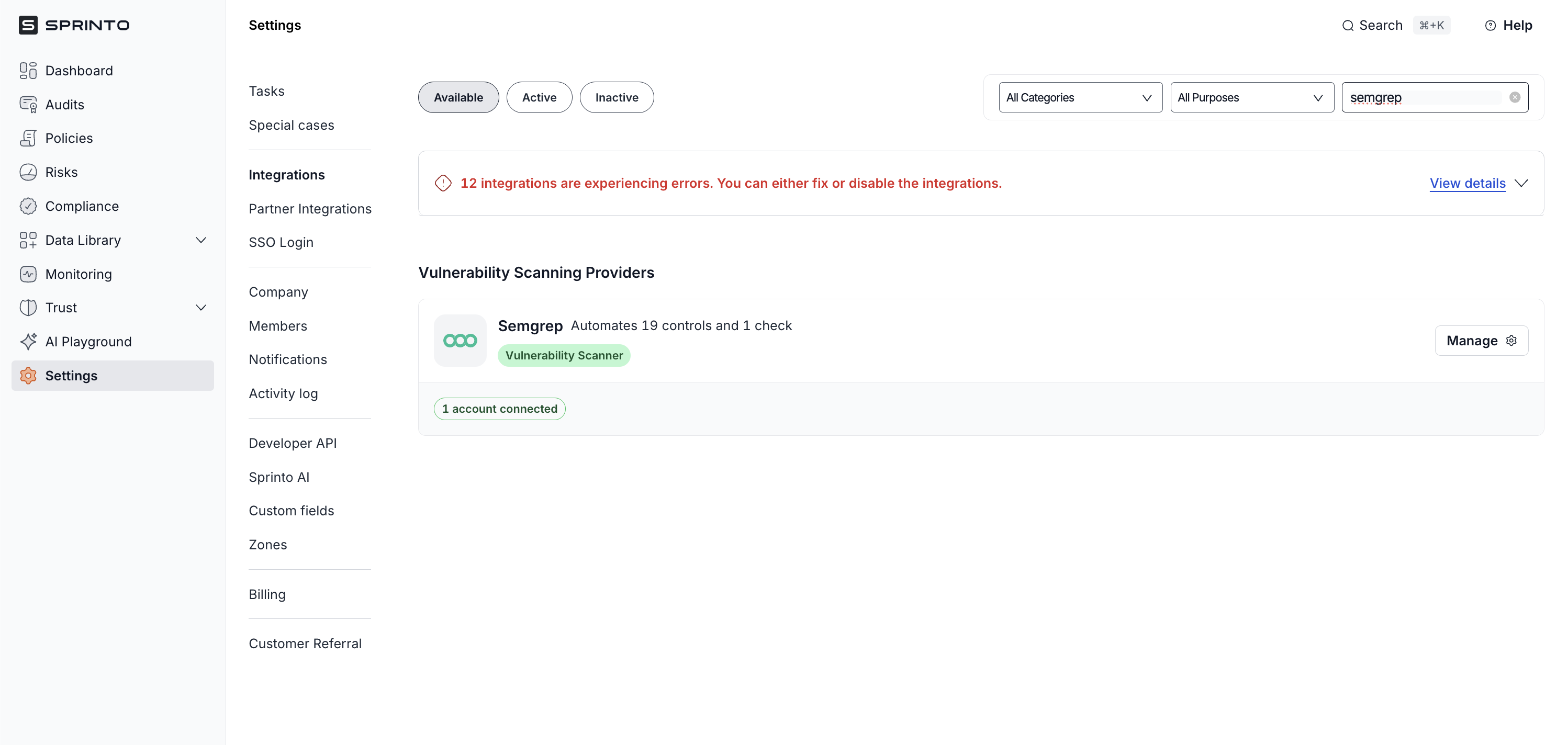 2. Integrate Semgrep on Sprinto.