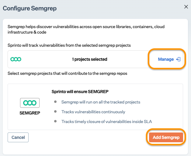 * If required, click on **Manage** to modify your selected projects, and click Add Semgrep.