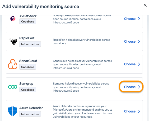 * On Add vulnerability monitoring source page, click Choose next to Semgrep.<br>