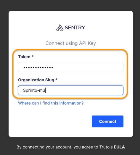 Enter the Token and Organization slug you copied in Step 1, and click Connect.