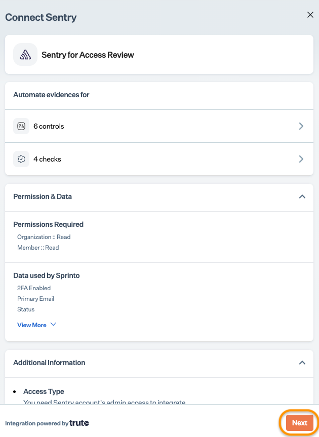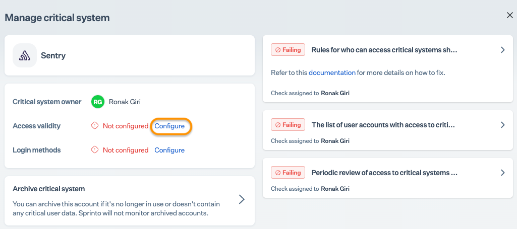 After completing Step 3, allow 15 to 20 minutes for Sprinto to finish the data syncing process. Sprinto may take up to 24 hours to evaluate the synced data and activate relevant Sprinto checks. If needed, visit Data Library > Access > Critical System to check for pending tasks next to Sentry.