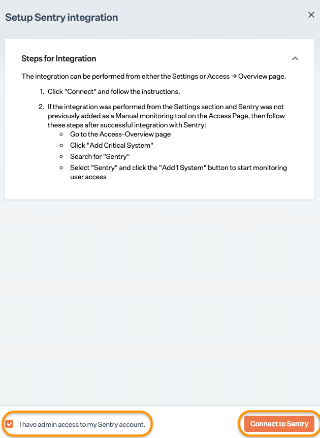 Ensure you have "Admin" access to the Sentry account intended for integration.