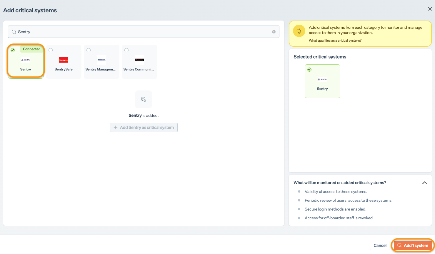 Select Sentry and click Add System.
