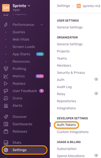 Upon logging in from the browser’s address bar, copy your organization slug. For example, if your browser has the URL https://sprinto-m3.sentry.io/, your Organization snug is Sprinto-m3.