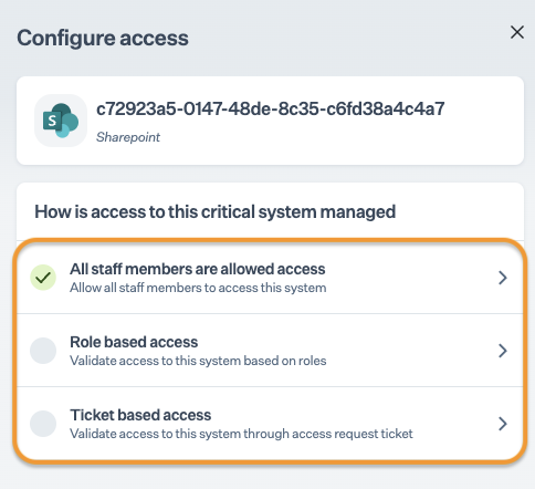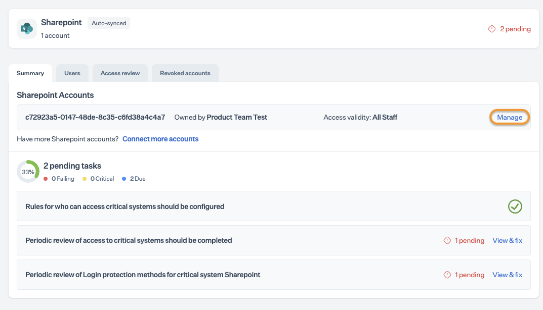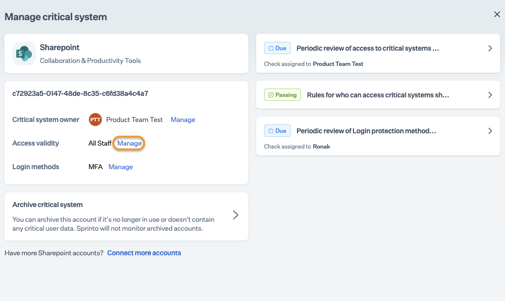 Your SharePoint account is integrated and configured as a critical system. Wait until Sprinto finishes the data syncing process. Upon completion, you can find failing Sprinto checks against staff members with invalid access. To Resolve these checks, you can either revoke staff members' access from the SharePoint account or modify the system's valid access type defined in Step 2.