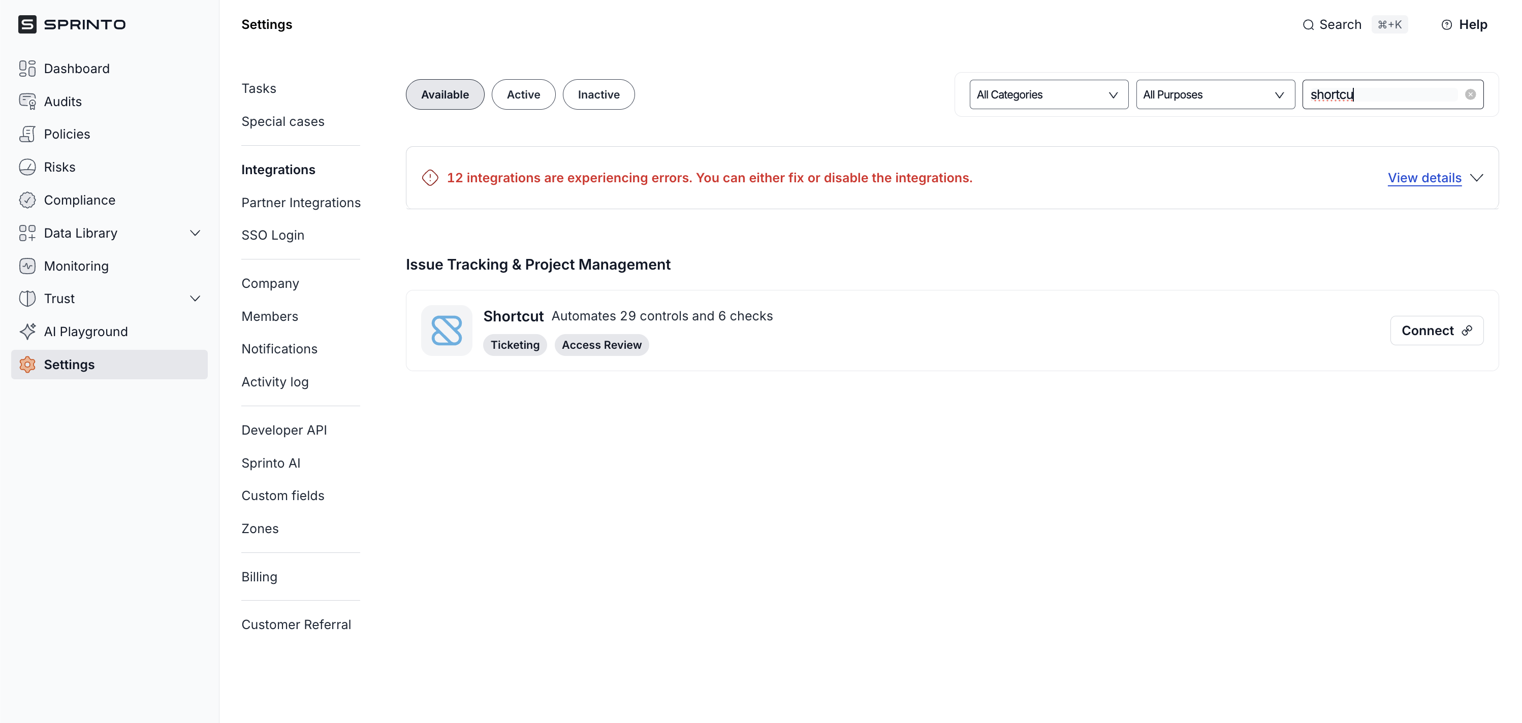 Shortcut is configured as a ticketing system on your Sprinto account. You can go to Data Library > Change Management > Shortcut to find out the pending tasks or refresh the database.