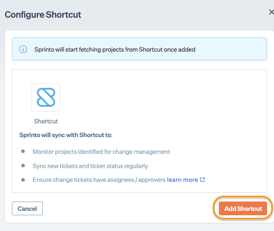 Click Add Shortcut. Note: Please wait until Sprinto finishes the data syncing process. The waiting time depends on the size of the database.