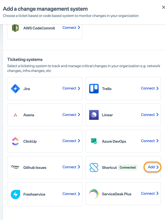 On the Add a Change Management System page, click Add next to Shortcut under the Ticketing systems.