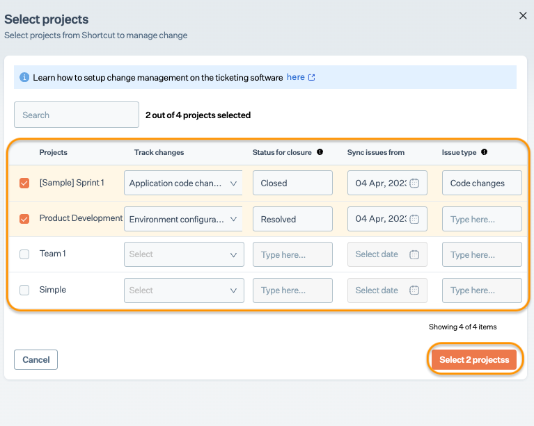 Select the checkbox next to the projects you wish to add on Sprinto to track the change tickets.
