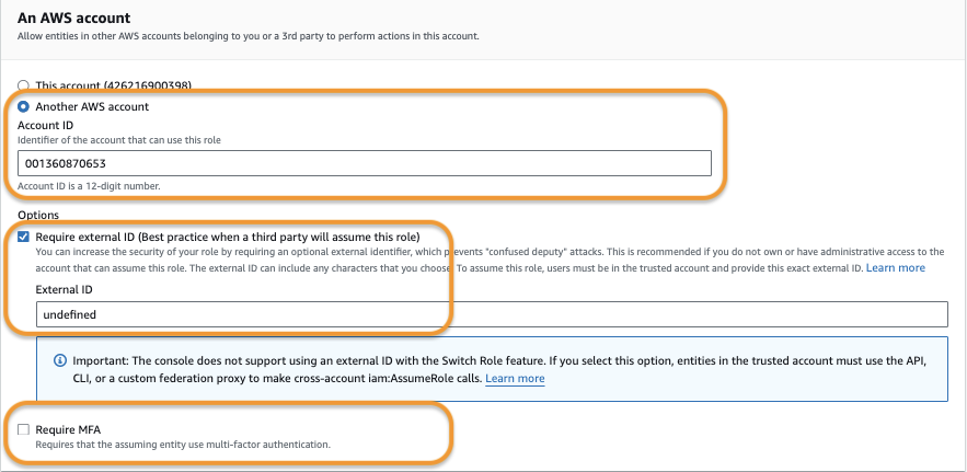 * Select the Another AWS account option, and enter the Account ID as 001360870653.