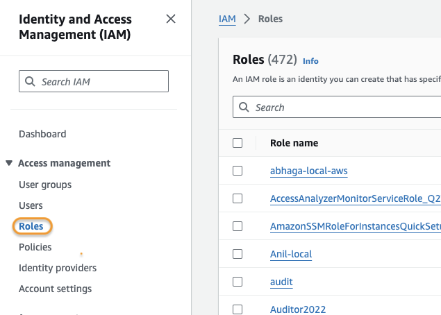 * Navigate to the IAM service, then select Roles under Access Management.