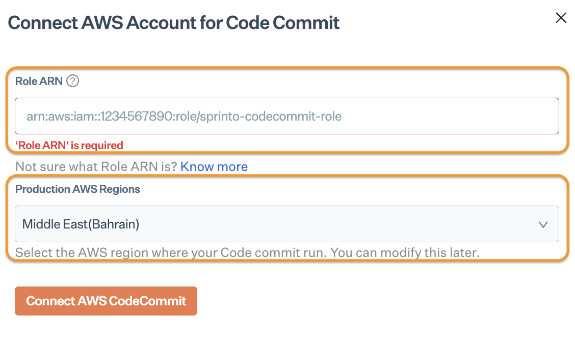 * Enter the ARN you copied from Step 1, and select your AWS account region.