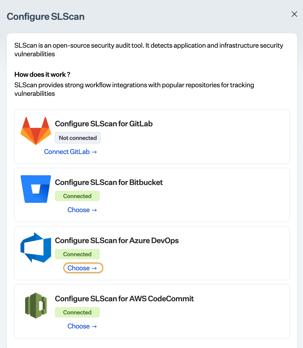 * Click Choose next to Configure SLScan for CodeCommit.