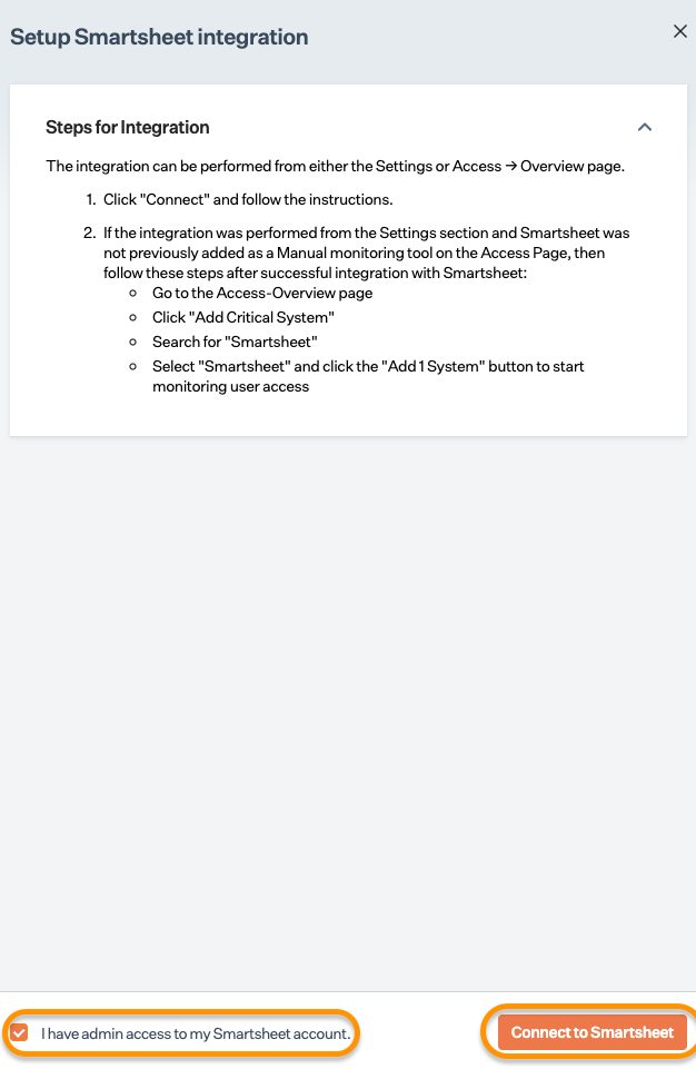 Ensure you have administrator privilege on Smartsheet to perform this integration procedure.