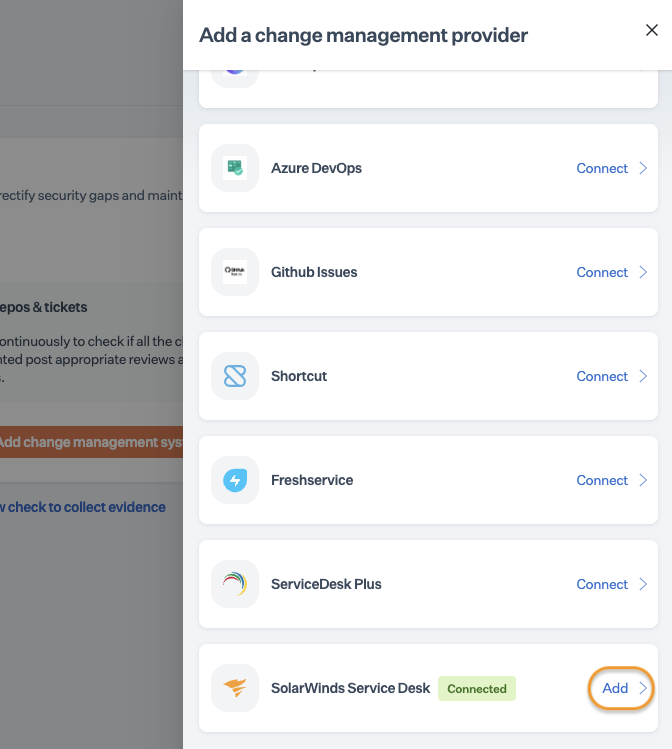 3. Click Add next to SolarWinds Service Desk under the ticketing systems. Note: For active connections, “Connected” is highlighted next to the services.<br>