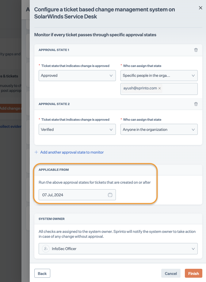 4. Select an applicable date. Sprinto validates the change tickets from the selected date.<br>