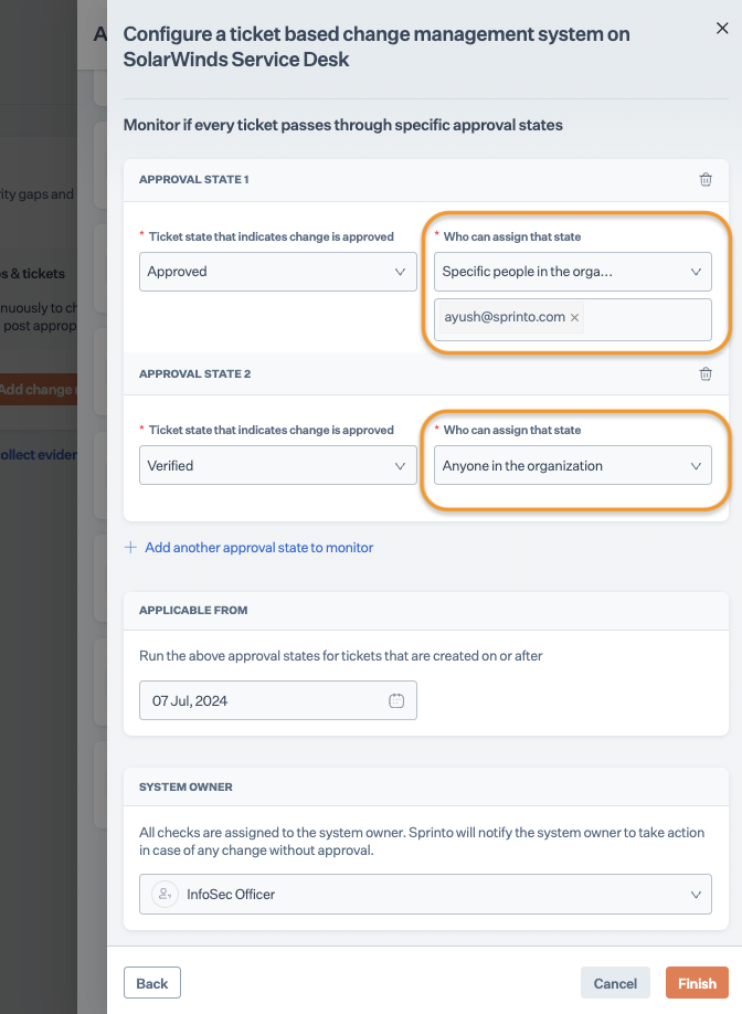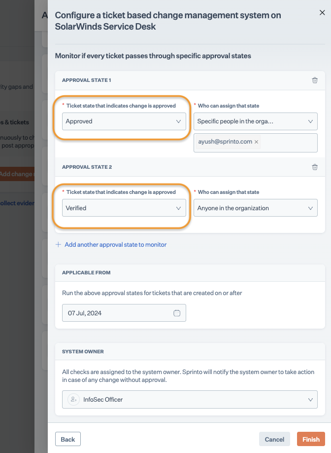 3. If required, click Add another approval state to monitor to add multiple approval states for change tickets.