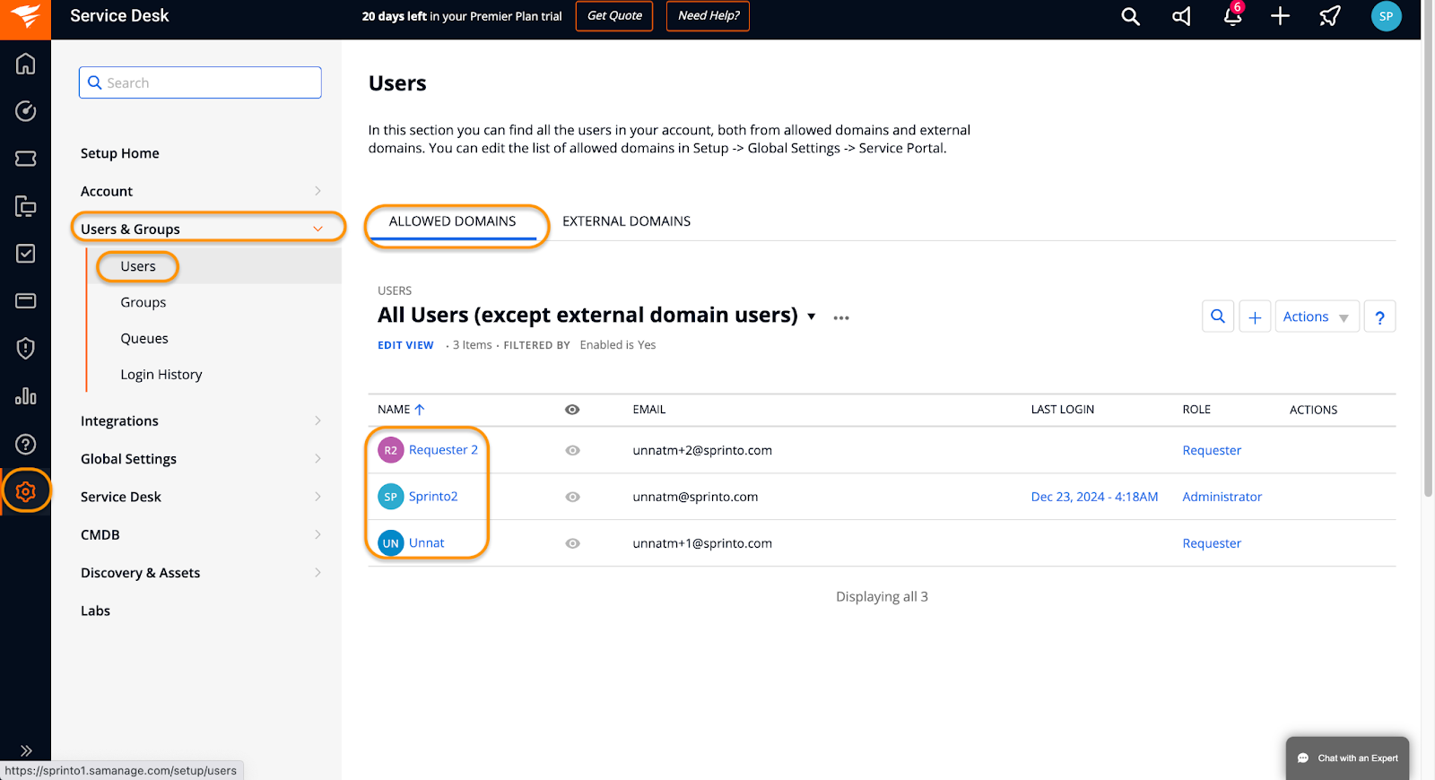 Note: Upon successful integration, you can find SolarWinds Service Desk under the Active tab.<br>