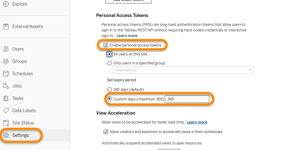 * Go to **Settings**, and select the checkbox for Enable personal access token.
