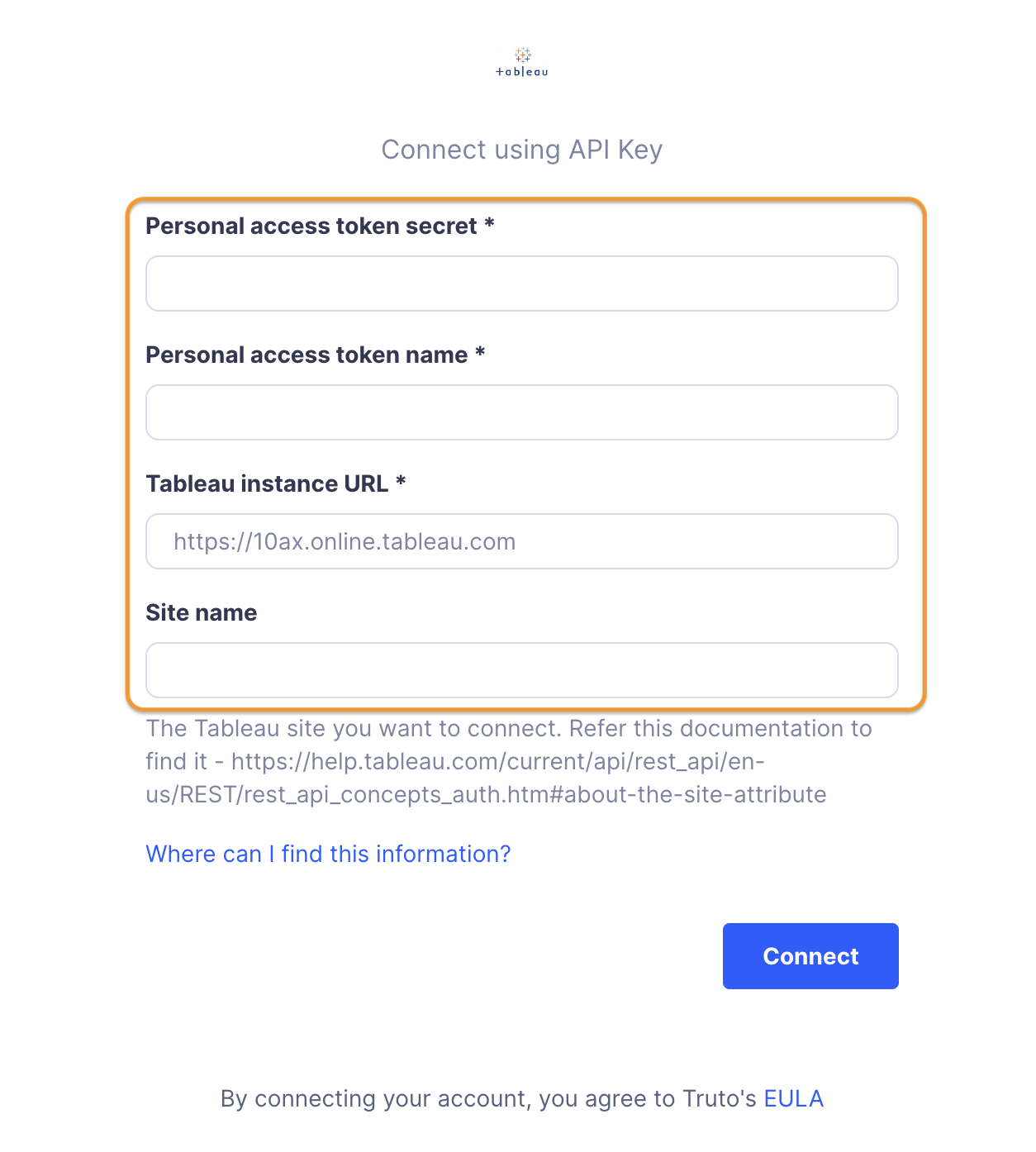 For example, if your Tableau URL is <https://example.online.tableau.com/#/site/sprintodev>, enter <https://example.online.tableau.com> as an instance URL in the field.
