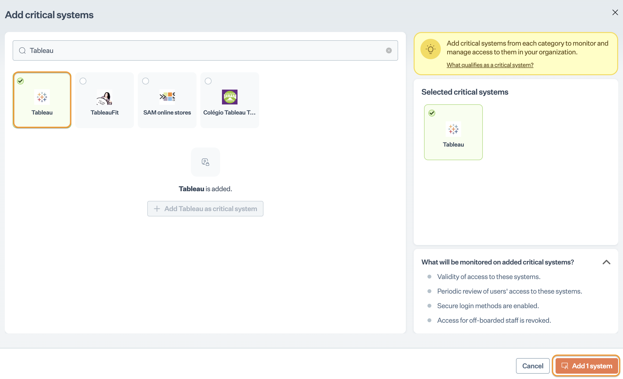 * On Add Critical System page, select Tableau and click Add System.