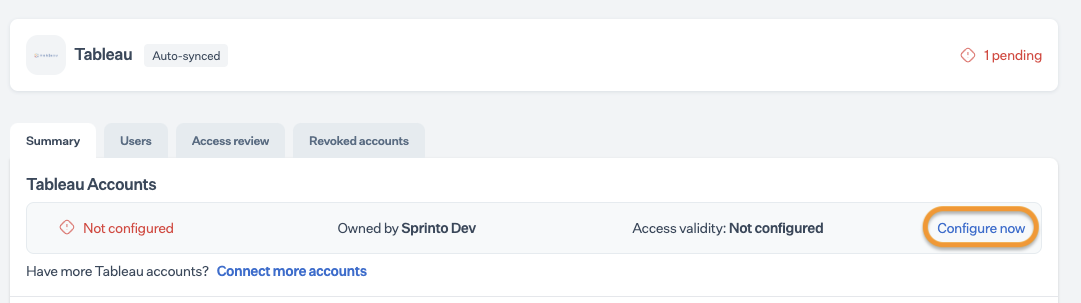 * On the Summary page, click Configure Now next to the Tableau account.