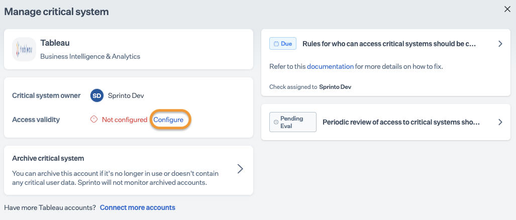 After completing Step 4, allow 15 to 20 minutes for Sprinto to finish the data syncing process. Sprinto may take a few hours to evaluate the synced data and activate relevant Sprinto checks. If needed, go to Data Library > Access > Critical System to check for pending tasks next to Tableau.