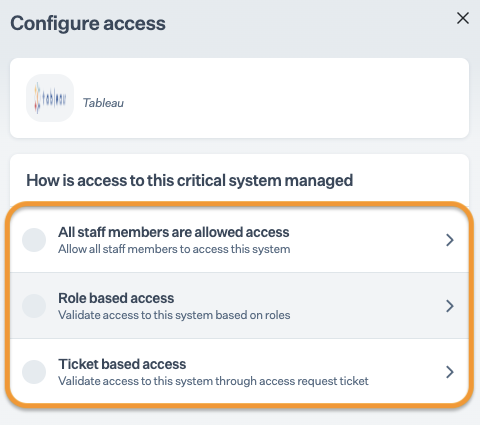 * Go to Data Library > Access > Critical systems, and select Tableau.