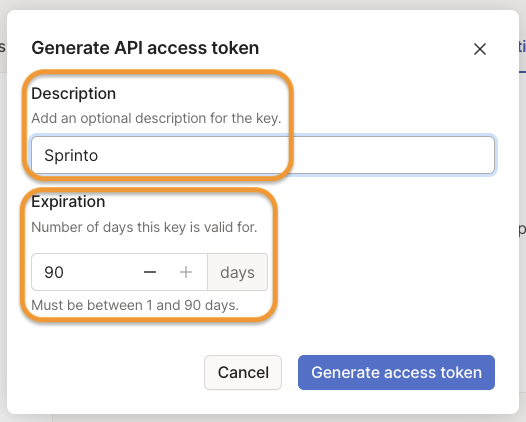 * Enter a description for the created token. Set the token expiry to a maximum (90 days) and click Generate access token.\