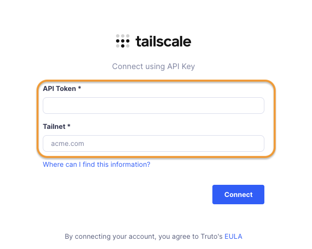 * Enter the API token you copied in Step 1, the Tailnet account subdomain, and click Connect.