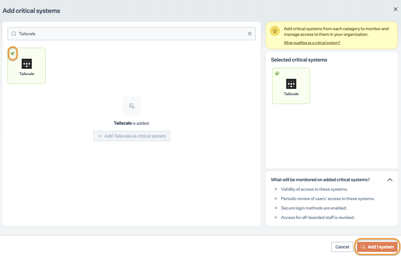* Navigate to Data Library > Access > Critical System, and select Tailscale.