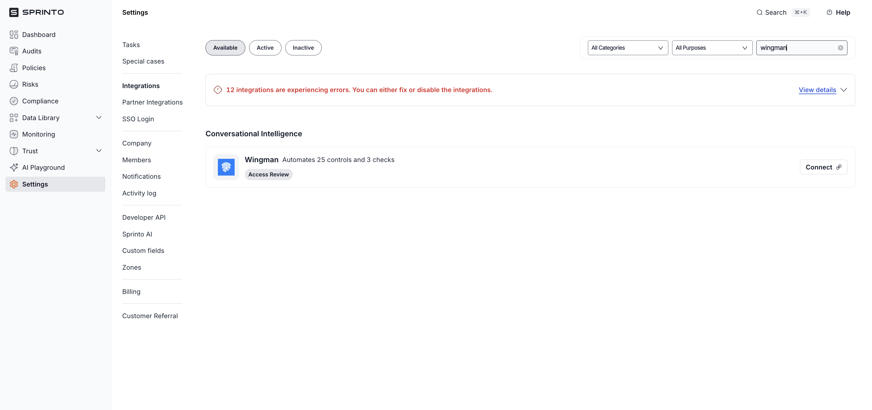On Sprinto app, go to Settings > Integrations > Available, and click Connect next to Wingman.