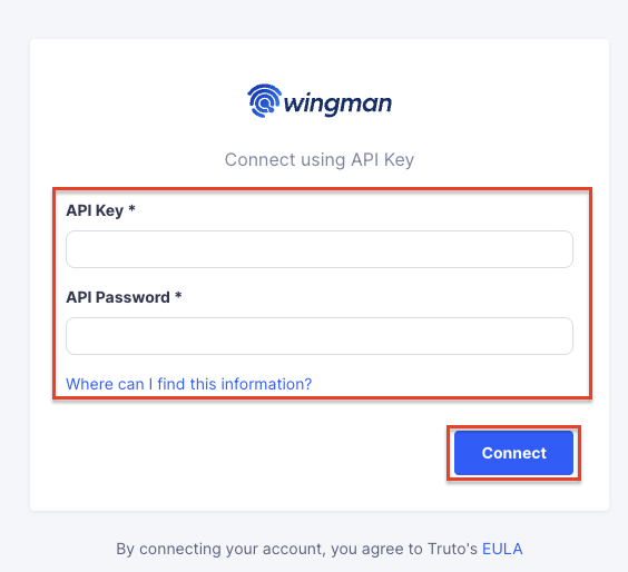 Enter the API Key and API Password (Secret) you have copied earlier in the respective fields, then click Connect. Note: This completes integrating Sprinto with your Wingman account. You can proceed with account configuration.