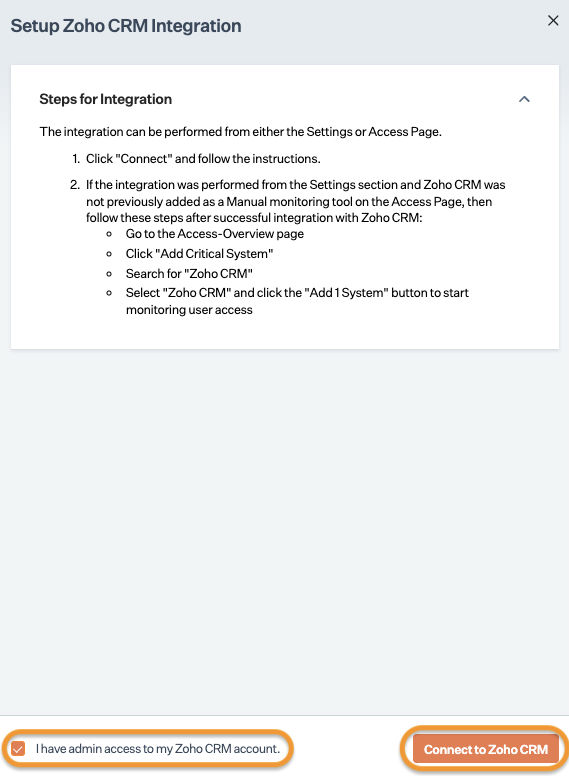 * Ensure you have “Admin” access on the Zoho CRM account you want to integrate.