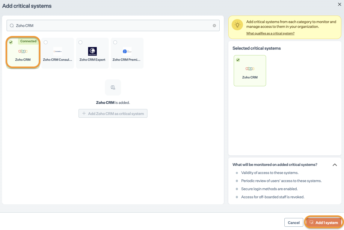 * On Add Critical System page, select Zoho CRM and click Add System.