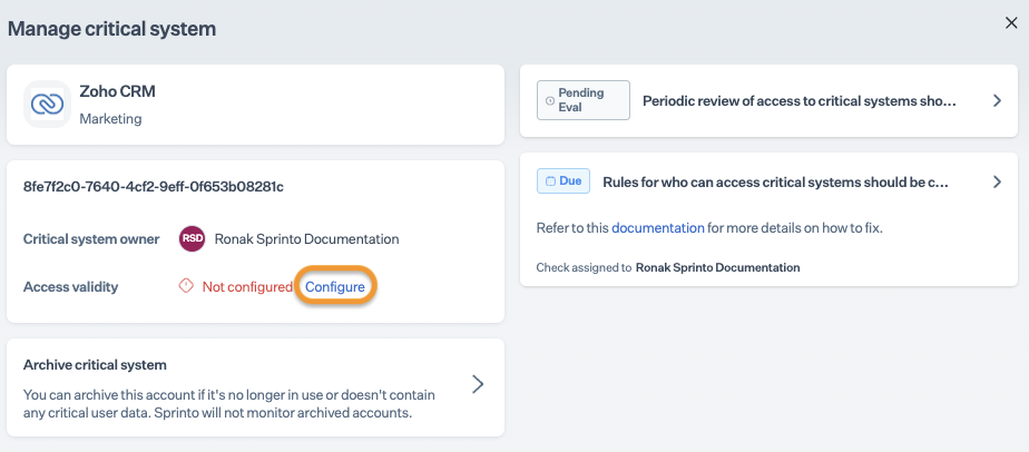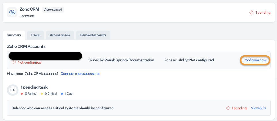After completing Step 4, allow 15 to 20 minutes for Sprinto to finish the data syncing process. Sprinto may take up to 24 hours to evaluate the synced data and activate relevant Sprinto checks. If needed, visit Data Library > Access > Critical System to check for pending tasks next to Zoho CRM.