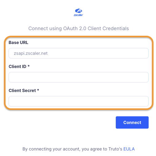 * On Authentication page, enter the Base URL, Client ID, and Client Secret copied from Step 1, and click Connect.