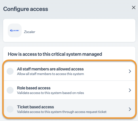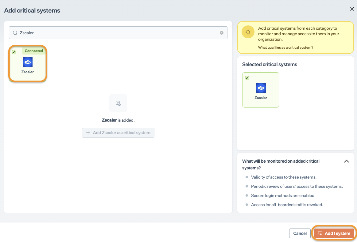 * Go to Data Library > Access > Critical systems, and select Zscaler.