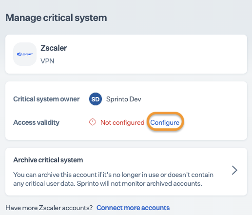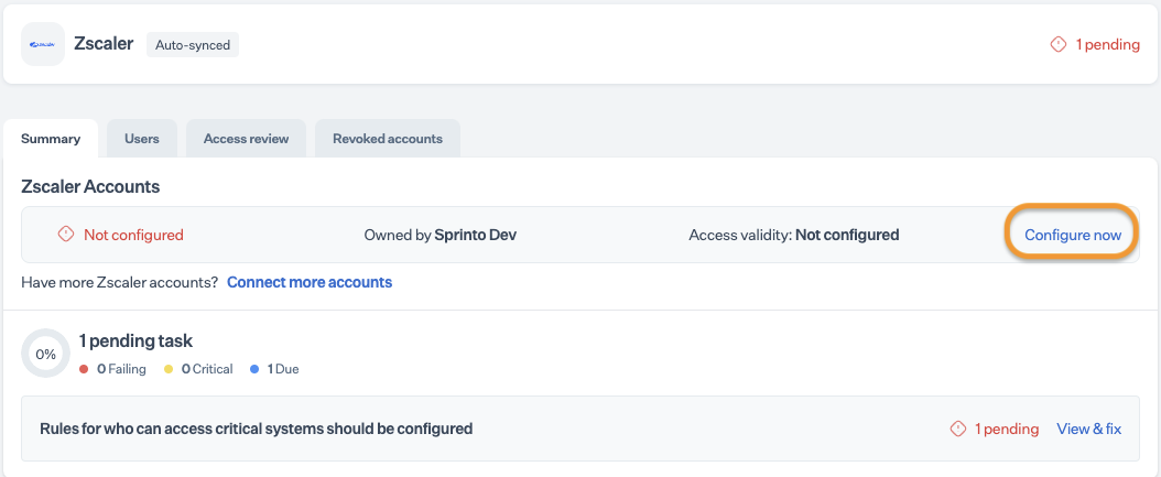 After completing Step 4, allow 15 to 20 minutes for Sprinto to finish the data syncing process. Sprinto may take a few hours to evaluate the synced data and activate relevant Sprinto checks. If needed, go to Data Library > Access > Critical System to check for pending tasks next to Zscaler.