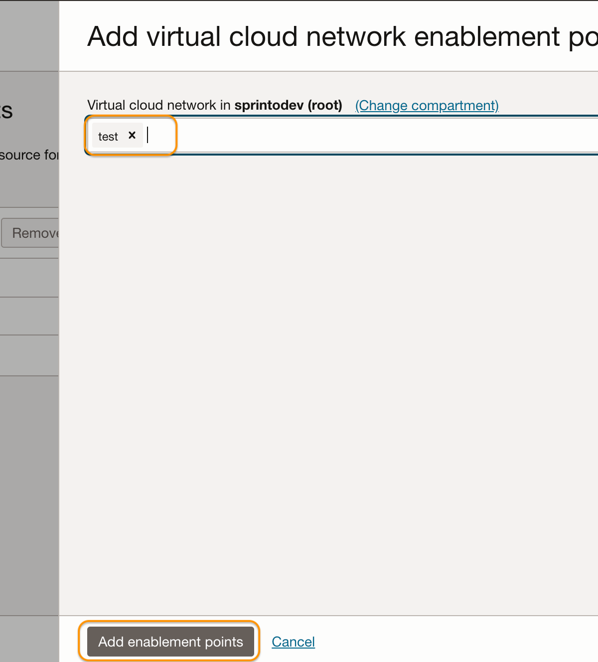 8. On Add Virtual Cloud Network Enablement Points page, select your desired VCN and click Add enablement point.<br>