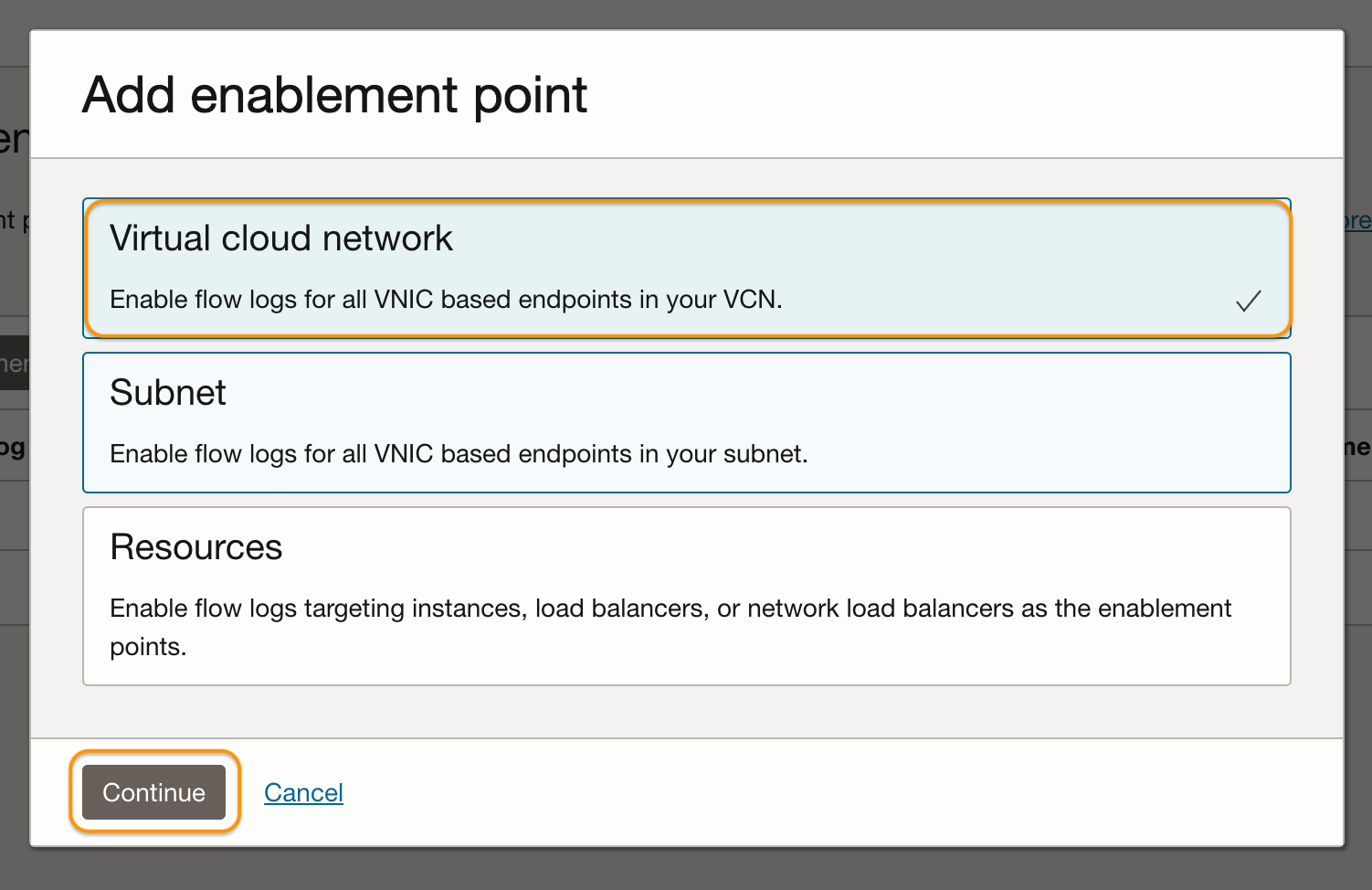 7. On the pop-up window, select Virtual Cloud Network and click Continue.<br>